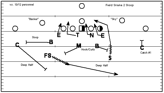 Against 10,12, and 22 personnel he is going to use "2 sloop" a form of cover 2 as the coverage behind the pressure.